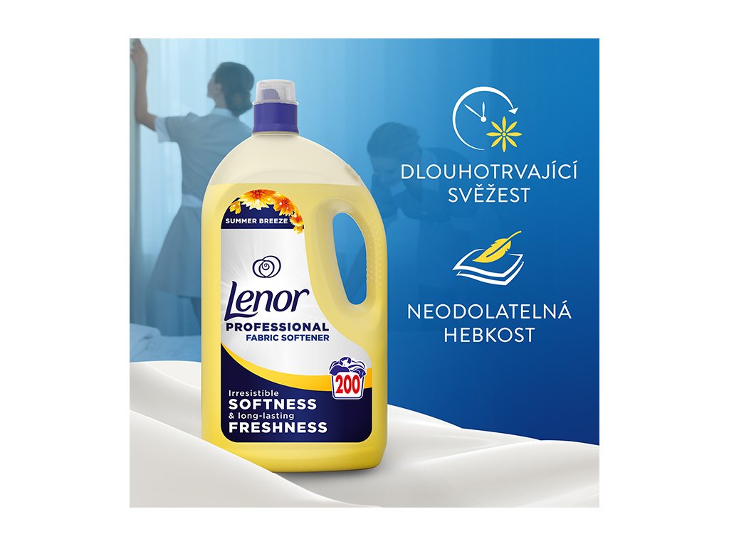 Aviváž Lenor Professional Summer Breezeje vyvinutá tak, aby prodlužovala životnost prádla a zároveň mu zajistila dlouhotrvající svěžest a hebkost. Speciální formule pro profesionální použití používá silnější aktivní složky. Obsahuje technologii zjemňování, která chrání vlákna před poškozením. Pomáhá tak prodloužit životnost prádla a šetří peníze za nákup nového. Zanechává na prádle parfémové mikro kapsle, které se třením postupně uvolňují a dodávají mu dlouhotrvající vůni. Díky difúzní technologii se vůně z prádla uvolňuje postupně a zanechává jej dlouhodobě svěží i po sušení v sušičce. Redukuje výskyt statické přilnavosti na tkanině.