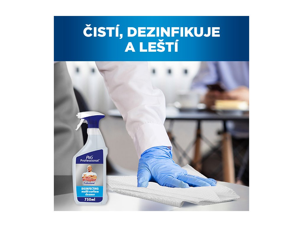 Dezinfekční čisticí prostředek Mr. Proper Professional 3v1 - čištění, lesk a dezinfekce v jediném spreji je připravený k okamžitému použití. Účinně likviduje 99,99 % obalených virů a bakterií během 15 sekund*. Běžně odstraňuje skvrny a otisky prstů na vnitřních plochách jako jsou stoly, pulty, stoličky, telefony, kliky od dveří nebo skleněné předměty. Nezanechává žádné šmouhy. Povrchy jako sklo apod. není po aplikaci potřeba oplachovat. Účinná látka: kvartérní amonium.